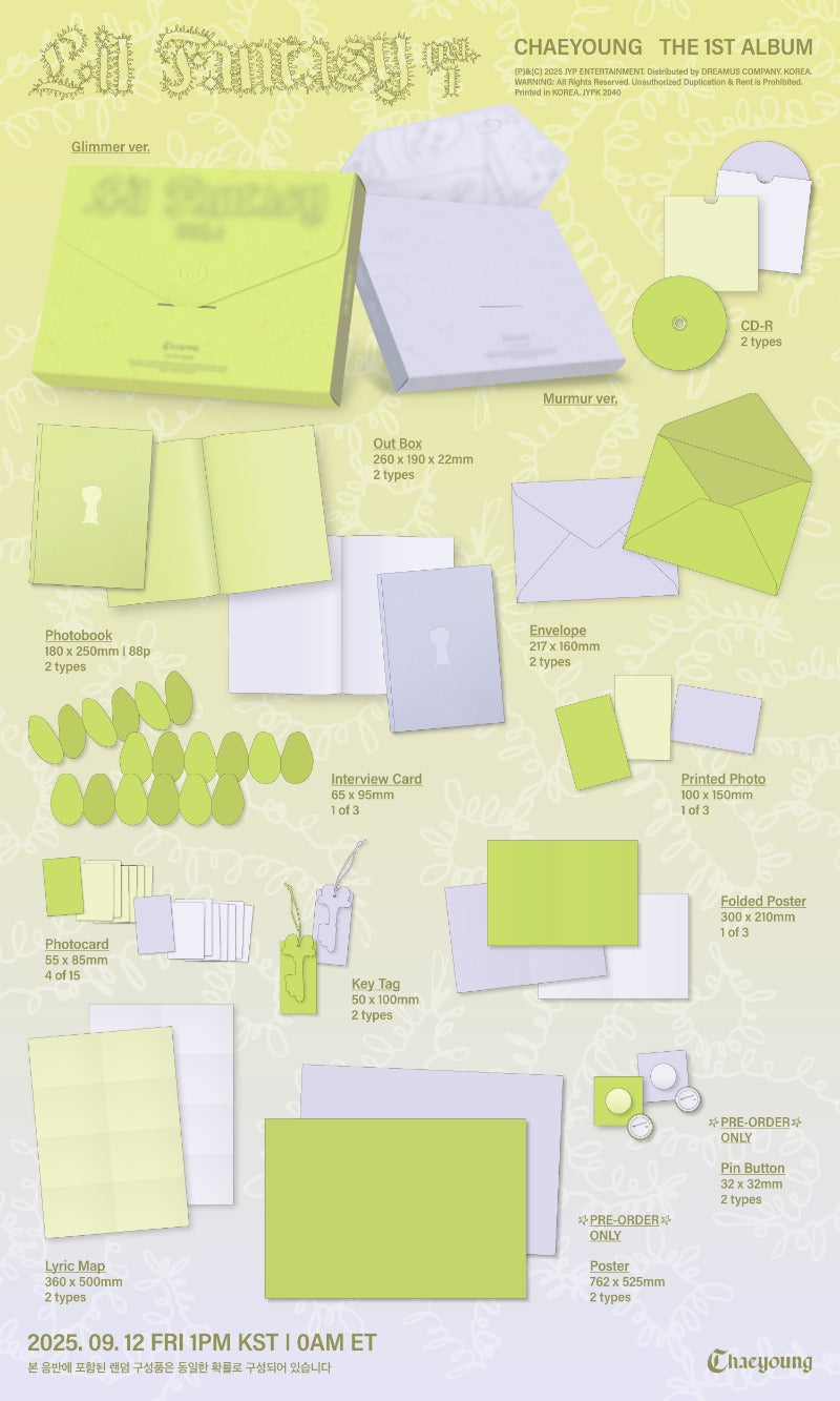 Packages Out Box : 260 X 190 X 22 (mm) / 2 Ver. CD-R : 2 Ver. Photobook : 180 X 250 (mm) / 88 p / 2 Ver. Envelope : 217 X 160 (mm) / 2 Ver. Interview Card : 65 X 95 (mm) / Random 1 ea out of 3 ea Printed Photo : 100 X 150 (mm) / Random 1 ea out of 3 ea Folded Poster : 300 X 210 (mm) / Random 1 ea out of 3 ea Photocard : 55 X 85 (mm) / Random 4 ea out of 15 ea Key Tag : 50 X 100 (mm) / 2 Ver. Lyric Map : 360 X 500 (mm) / 2 Ver.